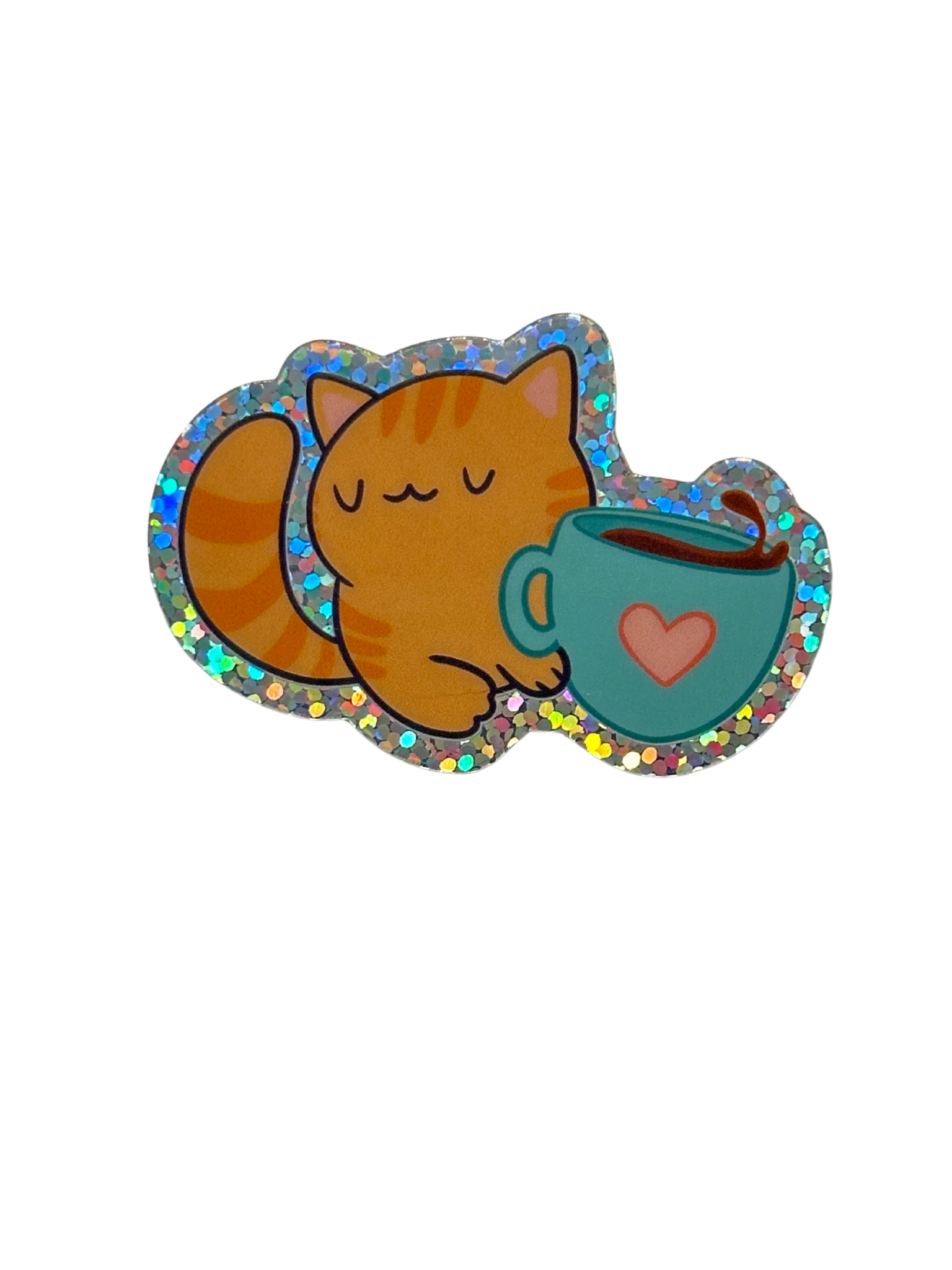 Start your day the Peaches way—coffee first, questions later. This 2” glitter sticker features your favorite orange cat clutching her caffeine with sparkle and sass.